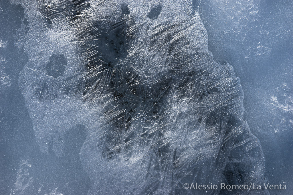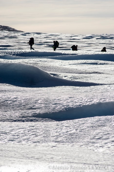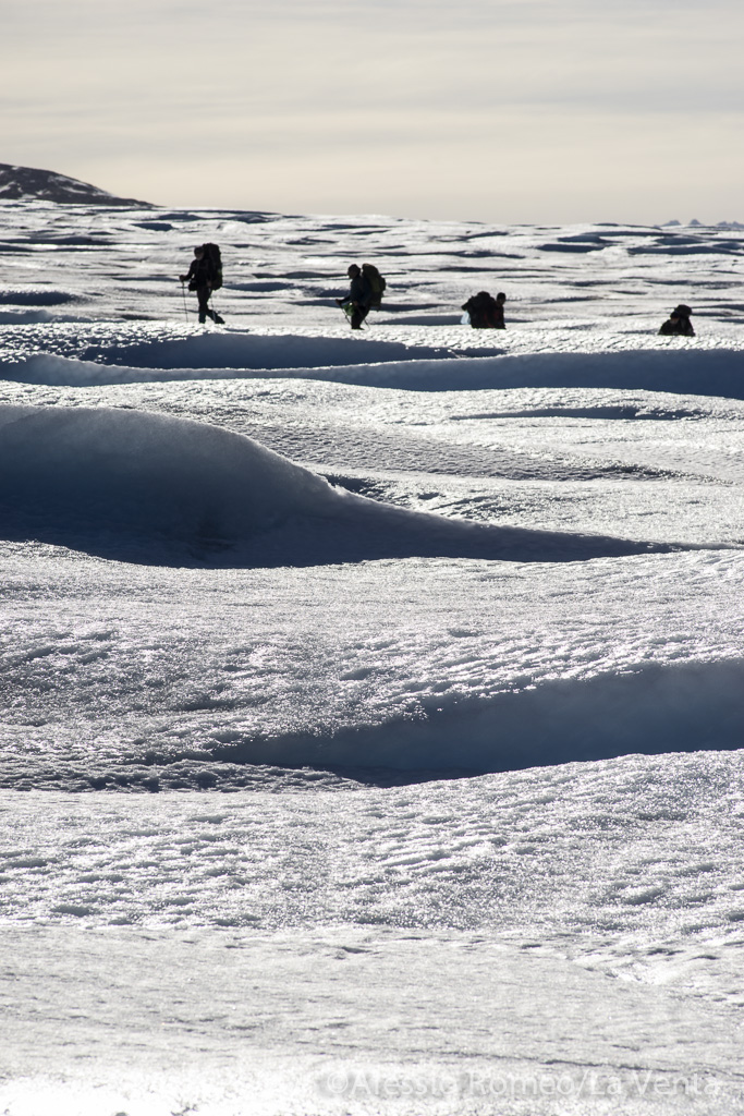 After 3 days of walk with heavy backpack, 9 caver had reached the icy surface. Two member of the first expedition, realised in February 2000, where part of the group. Them first impression was a huge changing of the shape because the drastic reduction in volume!